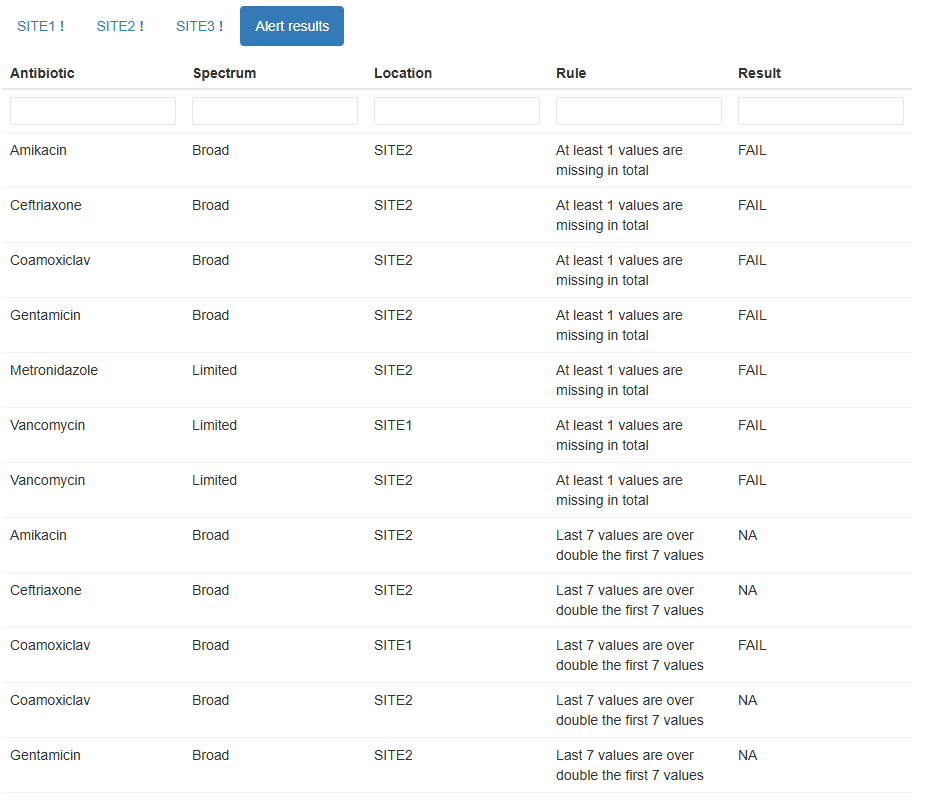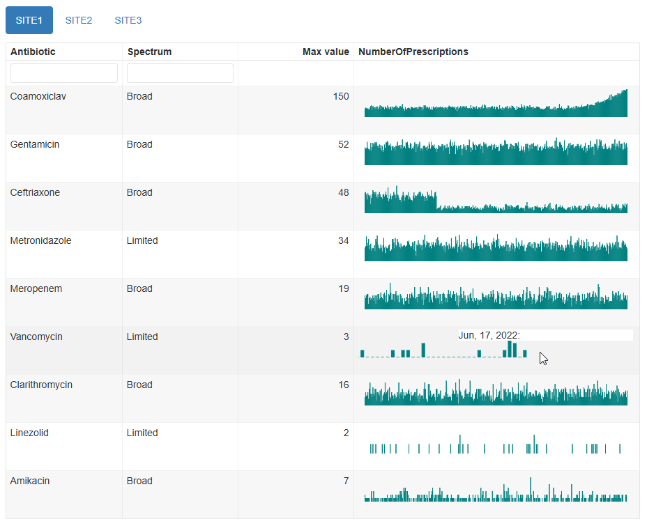 )In the SITE1 tab, the Vancomycin time series contains a block of NA values but it is not easy to distinguish between NA values and zero values unless you zoom in on the plot (by selecting a section of it with the mouse) or hover the mouse over the relevant time points and read the tooltips.